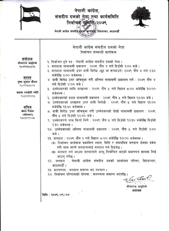 उम्मेदवारको अन्तिम नामावली प्रकाशन भने सोही दिन दिउँसो ३ बजे हुने तालिका छ । निर्वाचन भने बुधवार बिहान ६ बजेदेखि १० बजेसम्म हुने कांग्रेसले जनाएको छ ।