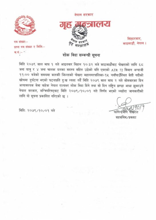 काठमाडौ, माघ २। ७२ जना सवार यती एयरलाइन्सको एटीआर विमान दुर्घटना भएकोमा सरकारले सोमबारका दिन अत्यावश्यक सेवाबाहेक आज शोक बिदा दिएको छ ।