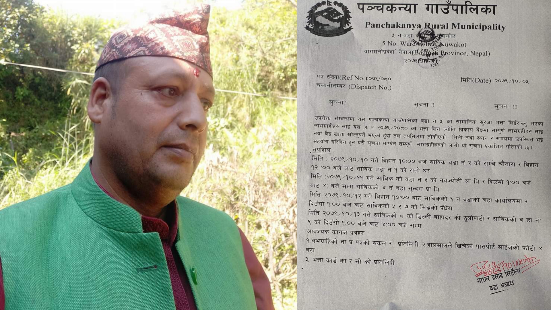 नुवाकोट,माघ ५ । जिल्लाको पञ्चकन्या गाउँपालिका वडा नम्बर ५ भद्रुटारका वडाध्यक्ष्य माधब सिटौला स्थानीय नागरिकको सामाजिक सुरक्षा भत्ता वितरण सहज तुल्याउन घरघरमा पुगेका छन् ।