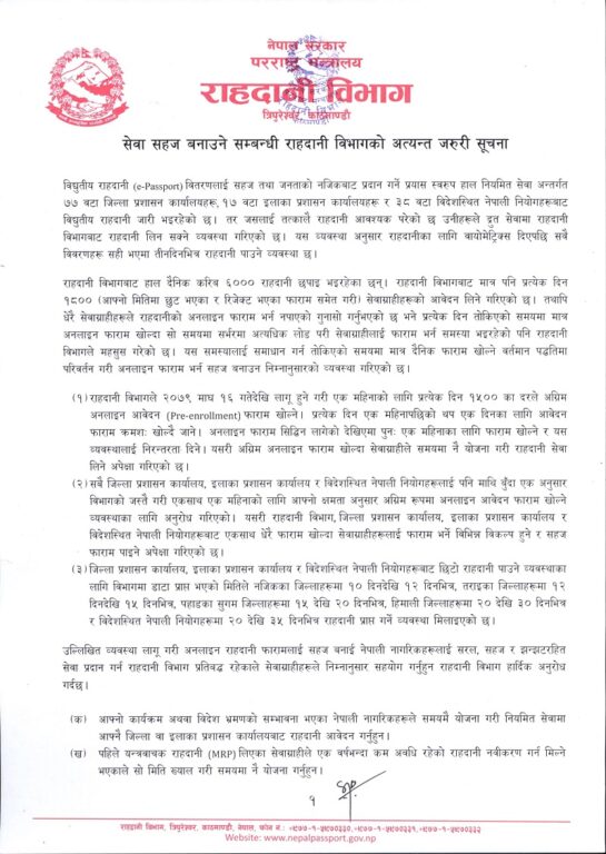 काठमाडौं, माघ १६ । राहदानी विभागले आजदेखि एक महिनाको अग्रिम अनलाइन आवेदन अर्थात् प्रि-इनरोलमेन्टको व्यवस्था गरेको छ ।