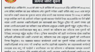 विभागले विगत आर्थिक वर्षहरुदेखि कर तिर्न बाँकी भएका मोटरसाइकल धनीहरुलाई कर तथा नवीकरण समयमै भुक्तानी गरेर लाभ लिन आग्रहसमेत गरेको छ ।