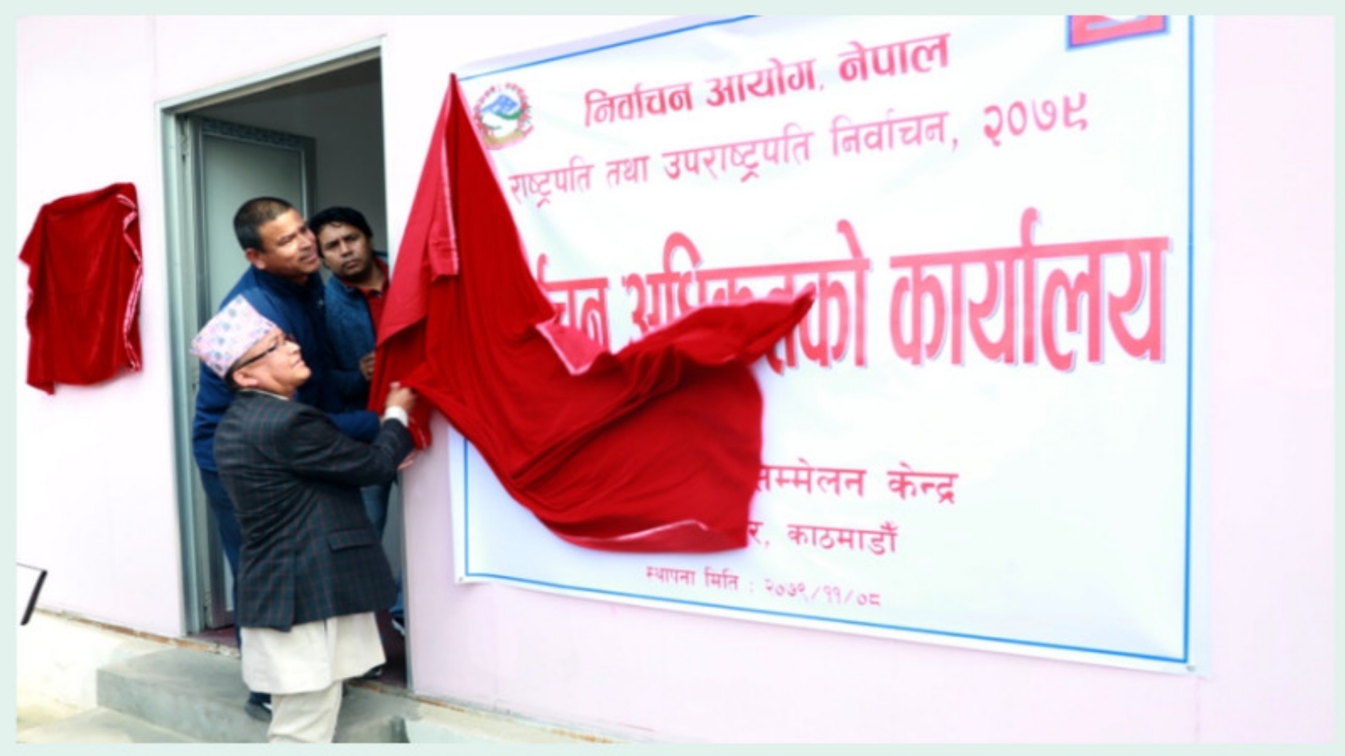 काठमाडौं,फागुन ९ । राष्ट्रपति तथा उपराष्ट्रपतिको निर्वाचनका लागि नयाँ बानेश्वरस्थित अन्तरराष्ट्रिय सम्मेलन केन्द्रको परिसरमा सोमवारदेखि निर्वाचन अधिकृतको कार्यालय सञ्चालनमा आएको छ । राष्ट्रपतिको निर्वाचन यही फागुन २५ गते र उपराष्ट्रपतिको निर्वाचन आगामी चैत ३ गते हुनेगरी निर्वाचन आयोगले गत माघ १६ गते मिति तय गरेको थियो ।