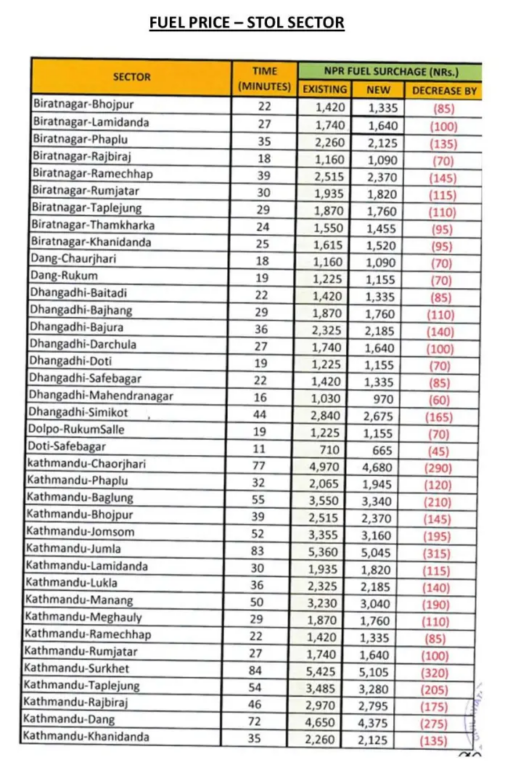 सरकारले इन्धनको मूल्यमा प्रतिलिटर १० रुपैयाँ कटौती गरेसँगै हवाई भाडा समेत घटेको हो । काठमाडौंबाट धनगढीको उडानमा सबैभन्दा धेरै ४४० रुपैयाँ भाडा घटेको छ ।