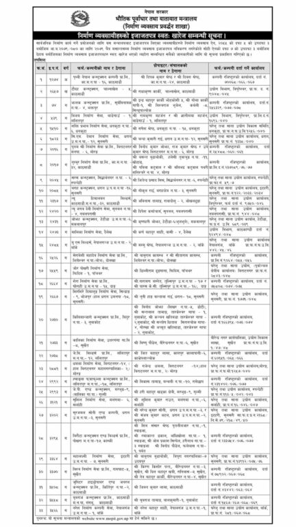 मन्त्रालयको निर्माण व्यवसाय प्रवद्र्धन शाखाका अनुसार चैत मसान्तसम्म नविकरण नगरेका व्यवसायीहरुको लाइसेन्स स्वतः खारेज भएको जनाएको छ ।