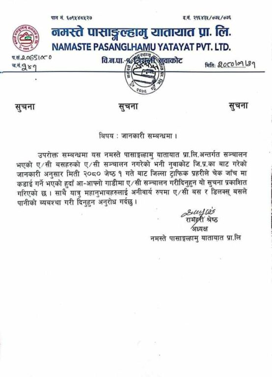 नुवाकोट, जेठ १ । पासाङ ल्हामु यातायातको डिलक्समा एसी चलाउन मातहतका समितिले निर्देशन दिएको छ । सोमबार एक सूचना जारी गर्दै नमस्ते पासाङ ल्हामु यातायात प्रालिले सो निर्देशन दिएको हो ।