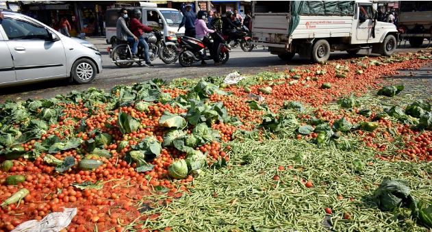 काठमाडौं,असार ४ । किसानले प्रतिकिलो ६ रुपैयाँभन्दा कम पाउने गोलभेडालाई उपभोक्ताले ४० रुपैयाँ तिरेर किनिरहेका छन् । यो अस्वाभाविक अवस्थाप्रति विरोध जनाउन आइतवार किसानले हजारौं किलो गोलभेडा काडमाडौंको सडकमा फालेका छन् । काठमाडौंको कालीमाटीस्थित तरकारी तथा फलफूल बजारअगाडि सडकमा आइतवार झन्डै ३९ हजार किलो गोलभेडा फालिएको थियो । फ्याँकिएको गोलभेडा हटाउन जेसीबी प्रयोग गर्नुपरेको थियो ।