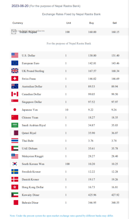 आजका लागि अष्ट्रेलियन डलर एकको खरिददर ८९ रुपैयाँ ५३ पैसा र बिक्रीदर ८९ रुपैयाँ ९४ पैसा, सिंगापुरे डलर एकको खरिददर ९७ रुपैयाँ ५२ पैसा र बिक्रीदर ९७ रुपैयाँ ९७ पैसा, जापनीज येन १० को खरिददर ९ रुपैयाँ २२ र बिक्रीदर ९ रुपैयाँ २६ पैसा कायम भएको छ ।