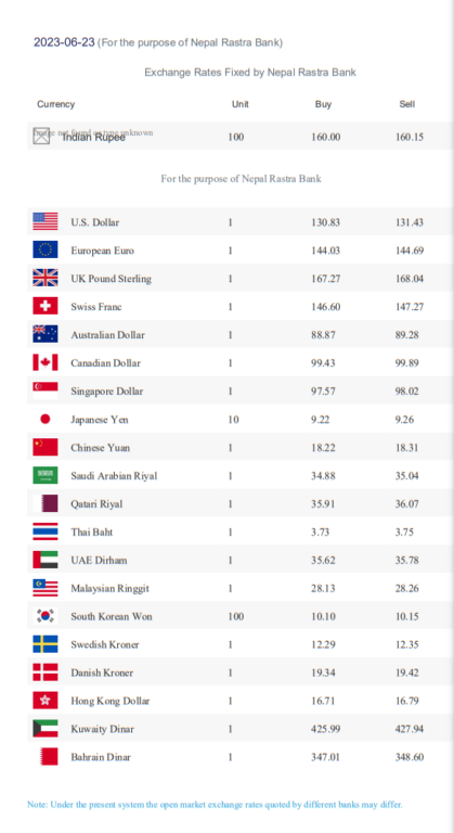 त्यसैगरि सिंगापुरे डलर एकको खरिददर ९७ रुपैयाँ ५७ पैसा र बिक्रीदर ९८ रुपैयाँ २ पैसा, जापानिज येन १० को खरिददर ९ रुपैयाँ २२ पैसा र बिक्रीदर ९ रुपैयाँ २६ पैसा तोकिएको छ ।