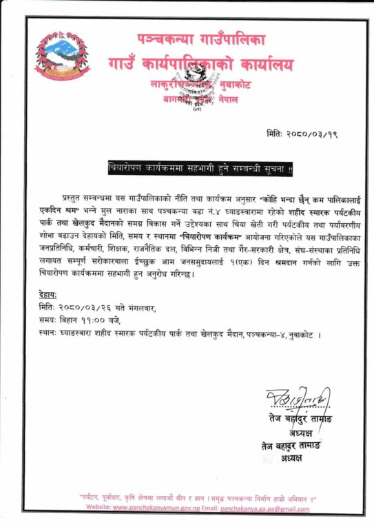 नुवाकोट पञ्चकन्याको घ्याङस्वाराँ पार्कमा भोलि चिया रोप्ने निम्तो