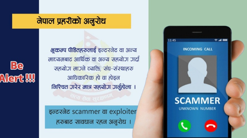 काठमाडौं,कात्तिक १९ । भूकम्प पीडितहरूको नाममा इन्टरनेट अथवा अन्य माध्यमबाट स्क्यामरहरूले आर्थिक सहयोग माग्दै ठगी गर्न सक्ने भन्दै सतर्क हुन नेपाल प्रहरीले अनुरोध गरेको छ । नेपाल प्रहरीले एक सूचना जारी गर्दै भूकम्प पीडितलाई सहयोग गर्दा इन्टरनेट स्क्यामर/एक्स्प्लोइटरहरूबाट सावधानी अपनाउन आग्रह गरेको हो ।