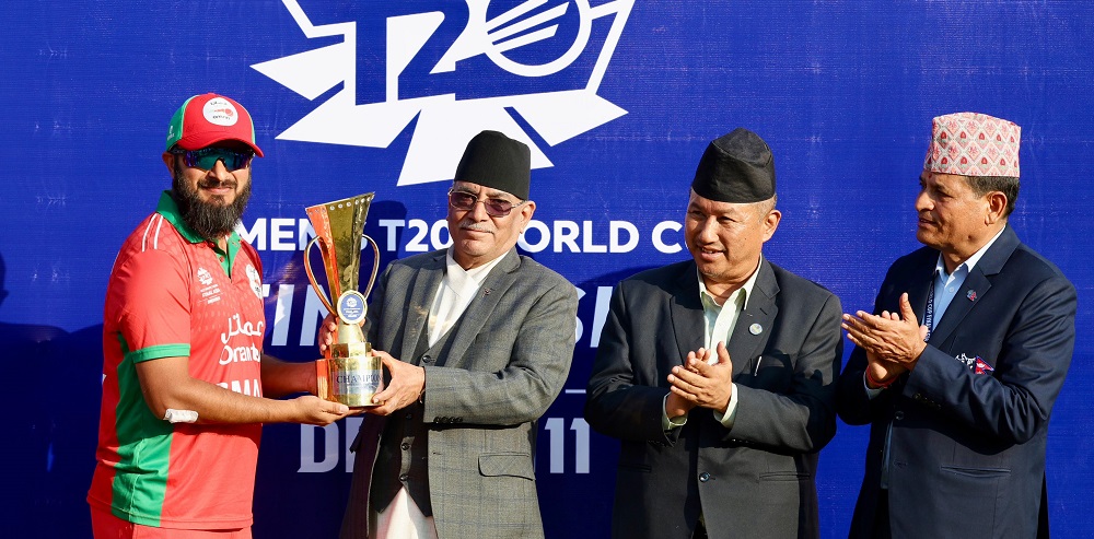 काठमाडौं,कात्तिक १९ । प्रधानमन्त्री पुष्पकमल दाहाल ‘प्रचण्ड’ले आइसिसी ट्वान्टी २० विश्वकप एसिया क्षेत्र छनोट प्रतियोगिताको विजेता ओमानलाई ट्रफी प्रदान गरेका छन् ।