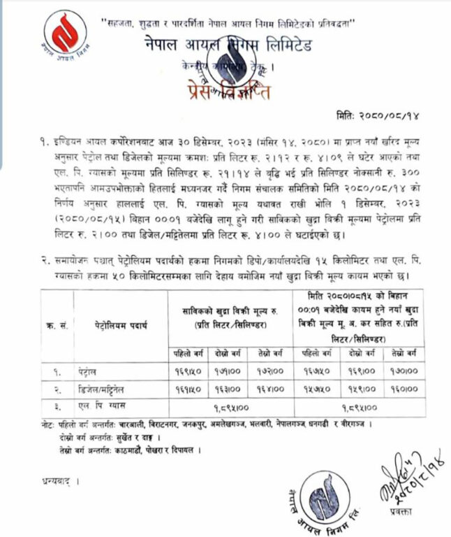 डिजेल र मट्टितेल भने क्रमशः १५७ रुपैयाँ ५० पैसा, १५९ रुपैयाँ र १६० रुपैयाँ पर्नेछ ।