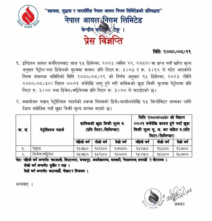 इन्डियन आयल कर्पोरेशनबाट शुक्रबार प्राप्त नयाँ खरीद मूल्य अनुसार पेट्रोल तथा डिजेलको मूल्य क्रमश: ३.०७ र ३.१६ रुपैयाँ घटेर आएकाले निगम सञ्चालक समितिको निर्णयअनुसार मूल्य घटाइएको निगमले शुक्रवार (आज) जारी गरेको प्रेस विज्ञप्तिमा उल्लेख छ ।