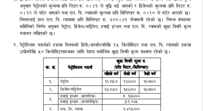 यस्तै, डिजेलको भने प्रतिलिटर १२ पैसा र खाना पकाउने एलपी ग्यासको भाउ प्रतिसिलिण्डर २० पैसाले घटेर आएको निगमको भनाई छ । तर, निगमलाई एलपी ग्यासमा प्रतिसिलिण्डर ३०० रुपैयाँ ४१ पैसाले नोक्सानी रहेको छ । सोही सन्दर्भलाई लिएर हाललाई पेट्रोलियम र खाना पकाउने एलपीको ग्यासको भाउ यथावत राखिएको निगमले जनाएको छ ।