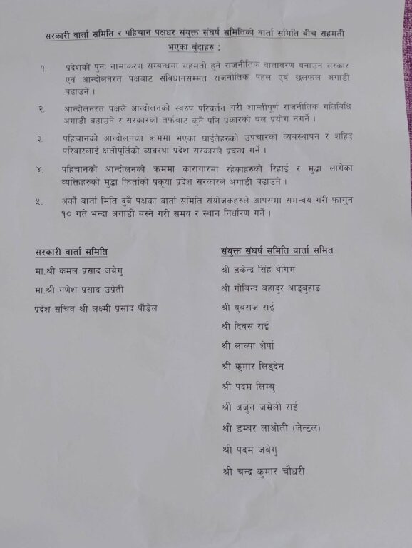आज दोस्रो दिनको वार्तामा दुई पक्षबीच सहमति भएको हो । सहमतिअनुसार प्रदेशको पुन: नामाकरण सम्बन्धमा सहमती हुने राजनीतिक वातावरण बनाउन सरकार एवं आन्दोलनरत पक्षबाट संविधानसम्मत राजनीतिक पहल एवं छलफल अगाडी बढाउने, आन्दोलनरत पक्षले आन्दोलनको स्वरुप परिवर्तन गरी शान्तीपूर्ण राजनीतिक गतिविधि अगाडी बढाउने र सरकारको तर्फबाट कुनै पनि प्रकारको बल प्रयोग नगर्ने, पहिचानको आन्दोलनका क्रममा भएका घाईतेहरुको उपचारको व्यवस्थापन र शहिद परिवारलाई क्षतीपूर्तिको व्यवस्था प्रदेश सरकारले प्रबन्ध गर्ने लगायत रहेका छन् ।