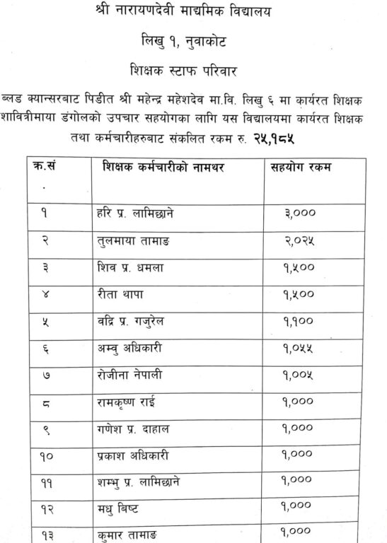 नुवाकोट,चैत ७ । लामो समयदेखि क्यान्सर पीडित सावित्रीमाया डङोलको उपचारका लागि लिखु गाउँपालिका वडा नम्बर १ मा अवस्थित नारायणदेवी माध्यमिक विद्यालयका शिक्षक कर्मचारीले आर्थिक सहयोग गरेका छन् ।