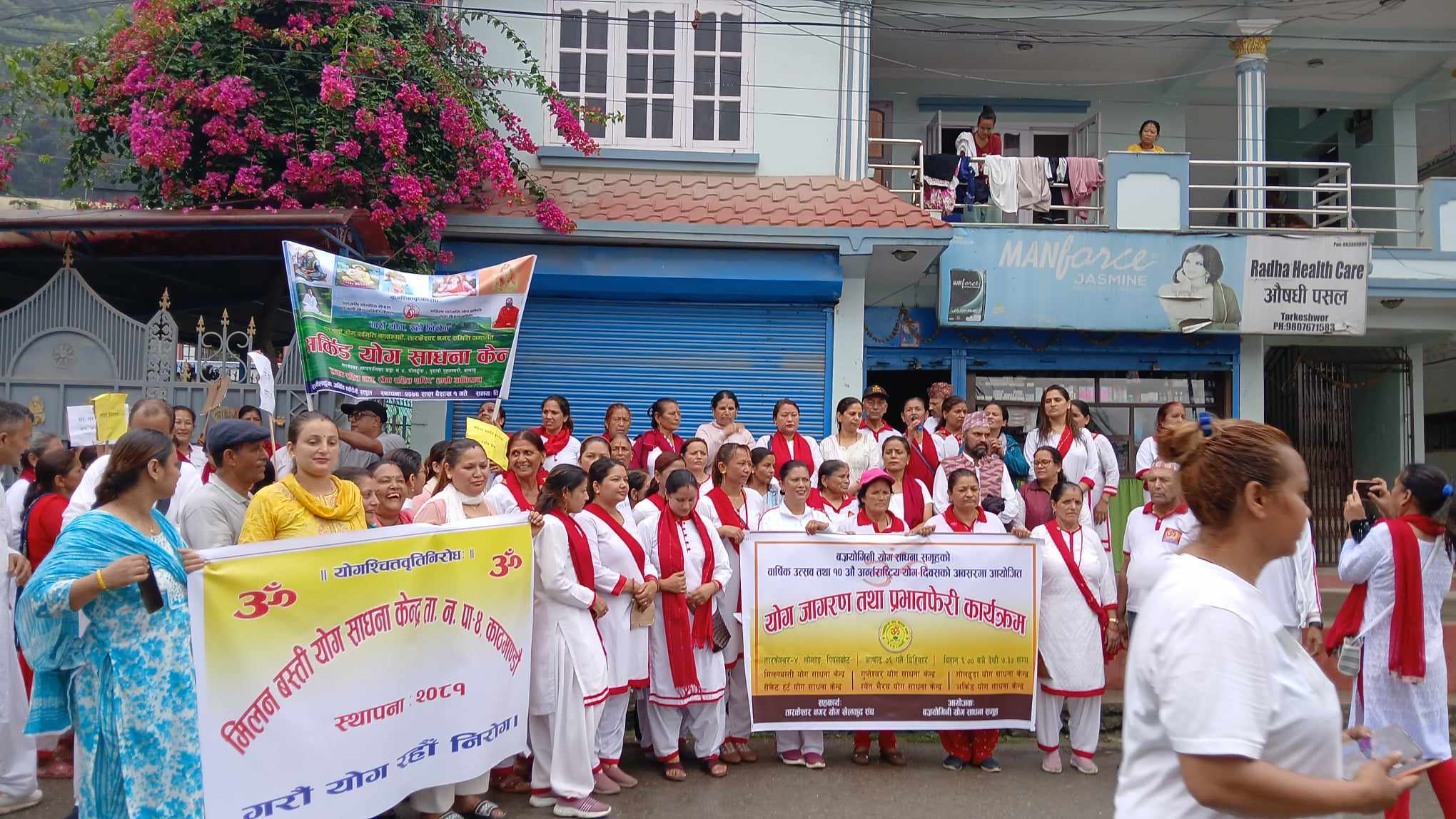 योग जागरण सम्बन्धी प्रेभातफेरि तारकेश्र्व्रर नगरपालिकामा भएको हो । “बज्रयोगिनी साधाना केन्द्रको वार्षिकोत्सब भव्य रुपमा सफल पारौं, गरौ योग- रहौ निरोग, घर घरमा योग जन जनमा योग, महिला सशक्तीकरणका लागि योग, सबैका लागि योग सधैका लागि योग, रक्तदान जीवन दान, लेखिएका प्लेकार्ड र योग जागरण सम्बन्धित ब्यानरहरु सहित कार्यक्रम शुरु भएको थियोे ।