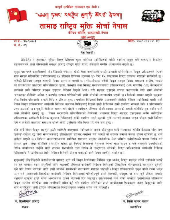 काठमाडौ,साउन २२ । राष्ट्रिय तामाङ मुक्ति मोर्चाले नेपाल विद्युत प्राधिकरणको कार्यकारी निर्देशकबाट कुलमान घिसिङलाई हटाउने खेलमा सरकार लागेको भन्दै आपत्ति जनाएको छ ।