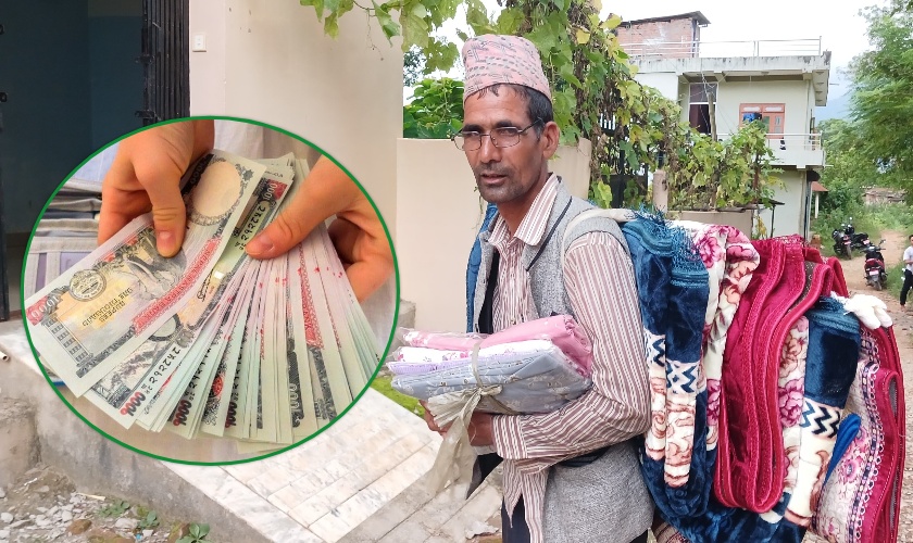 हुम्लाको कनका सुन्दरी गाउँपालिका–८ सिञ्जाका काफ्ले झण्डै डेढ दशकदेखि रामपुर र यसका आसपासमा कपडाको व्यापार गरिरहेका छन् । हरेक दिन ढाका टोपी, इस्टकोटकमा सजिएर पिँठ्युमा राडीपाखी, गलैँचा बोकेर गाउँगाउँमा पुग्ने गर्छन् । जुम्लामा उत्पादन भएका राडीपाखी, गलैँचा, स्वीटर बोकेर गाउँका बस्तीमा व्यापार गर्नु उनको दिनचर्या हो ।