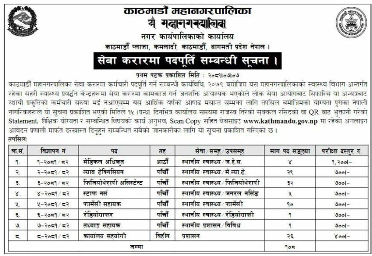 कार्यालय सहयोगीदेखि आठौँ तहका मेडिकल अधिकृत माग गरेको छ। इच्छुक योग्यता पुगेका नेपाली नागरिकले सूचना प्रकाशित भएको १५ दिनभित्र कार्यालय समयमा आवेदन दिन महानगरपालिकाले आग्रह गरेको छ।