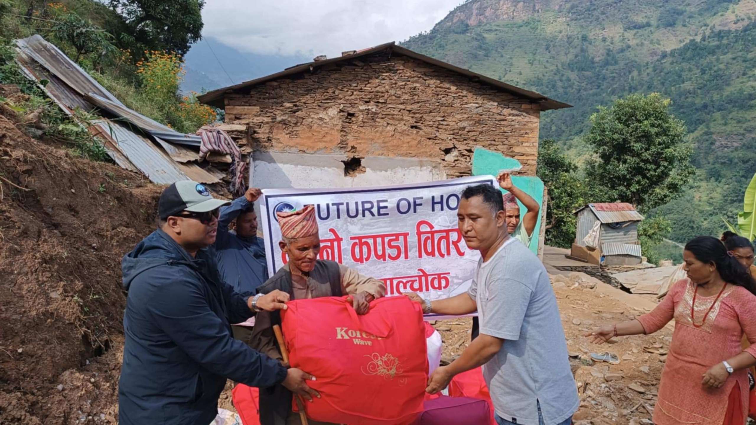 फि्युचर अफ होप नामक संस्थाको सहयोगमा पत्रकार तथा सामाजिक अभियन्ता निरोज तोलांगेको पहलमा पहिरो पीडितलाई सिरक र ज्याकेट वितरण गरिएको हो । उनीहरू बस्दैआएको कुनेगाउँमै पुगेर सो संस्थाकी संस्थापक अध्यक्ष अनिला थापा, विपद् व्यवस्थापन निर्देशक कवि थापा, अभियन्ताहरू तोलांगेले सो सामग्री वितरण गरेका हुन् ।