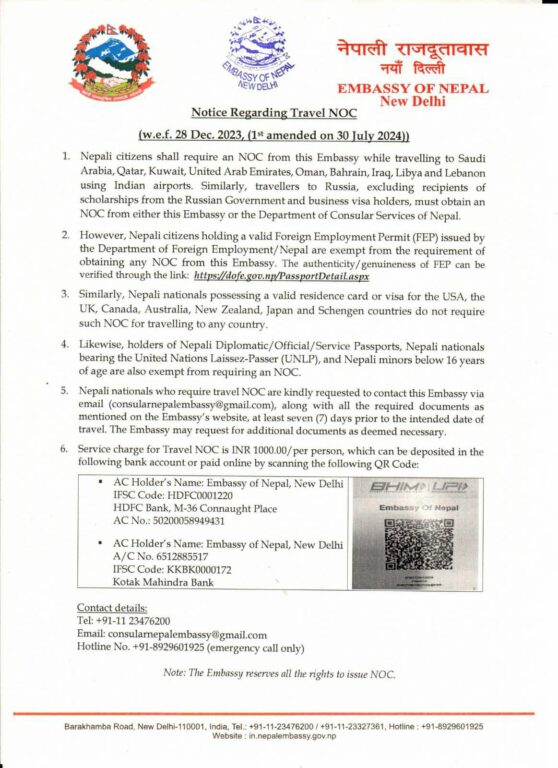 काठमाडौं,कात्तिक २७ । श्रम स्वीकृति भएका नेपाली नागरिकहरूलाई भारतको विमानस्थल हुँदै श्रम गन्तव्य मुलुक जानको लागि नो अब्जेक्सन लेटर (एनओसी) नचाहिने भएको छ । साथै अमेरिका, बेलायत लगायत शेन्जेन मुलुकको प्रवेषाज्ञा पत्र (भीसा) भएका नेपाली नागरिकहरूलाई पनि एनओसी नचाहिने व्यवस्था भएको भारतस्थित नेपाली दूतावासले सोमवार जारी गरेको एक सूचनामा उल्लेख छ ।