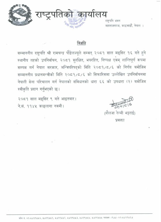 यही मङ्सिर १६ गते हुने उपनिर्वाचन सुरक्षित, भयरहित, निष्पक्ष एवम् शान्तिपूर्ण रूपमा सम्पन्न गर्न मन्त्रिपरिषद्को निर्णय बमोजिम राष्ट्रपति पौडेलले आइतबार सेना परिचालन गर्न स्वीकृति दिएका हुन् ।