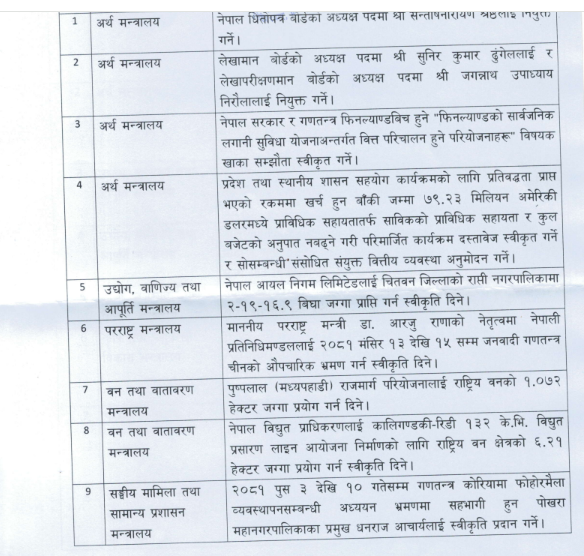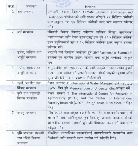 मन्त्रिपरिषद निर्णय: प्रधानमन्त्रीको चीन भ्रमण स्वीकृतदेखि उखुको समर्थन मूल्य निर्धारणसम्म