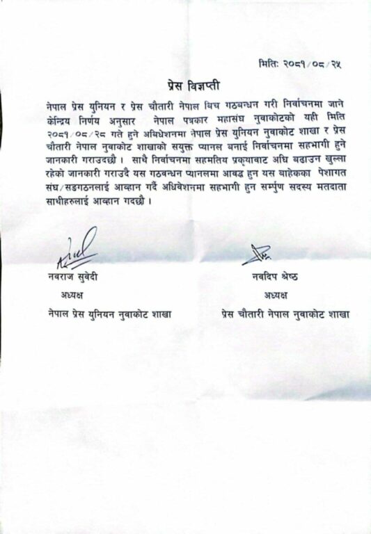 नुवाकोटमा प्रेस युनियन र प्रेस चौतारीबीच सहमतिमा नेतृत्व चयन गर्ने लिखित सहमति भएको छ । युनियनका अध्यक्ष नमराज सुवेदी र चौतारीका अध्यक्ष नवदिप श्रेष्ठ ले संयुक्त रुपमा हस्ताक्षर गर्दै केन्द्रको निर्देशन अनुसार अघि बढ्ने प्रतिवद्धता जनाएका छन् । दुवै संगठनले सहमतिका लागि ढोका खुला भएको समेत विज्ञप्तिमा उल्लेख गर्दै अन्य संगठनलाई पनि सहमतिका लागि आह्रवान गरेका छन् ।