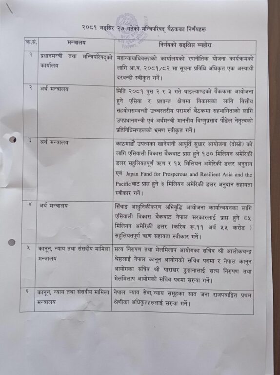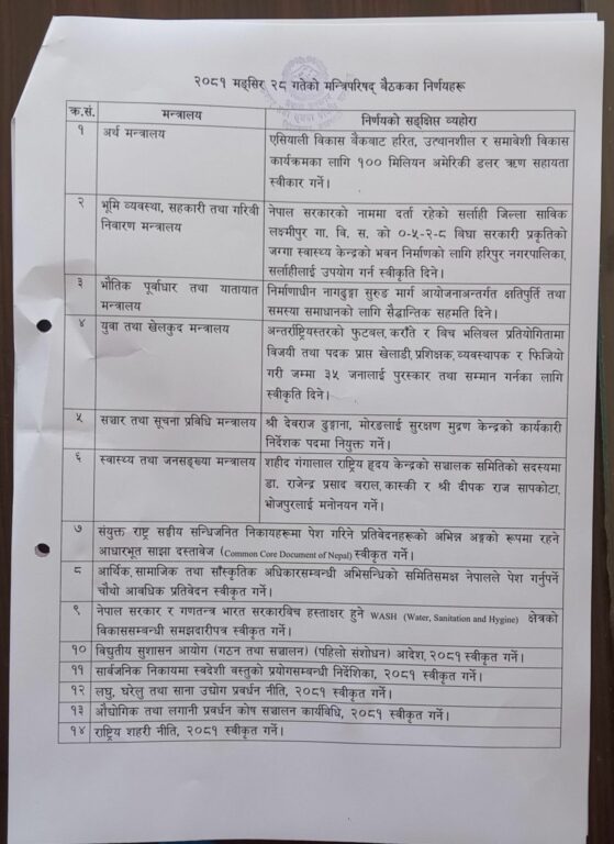 मन्त्रिपरिषद् बैठकका १४ निर्णय (सूचीसहित)