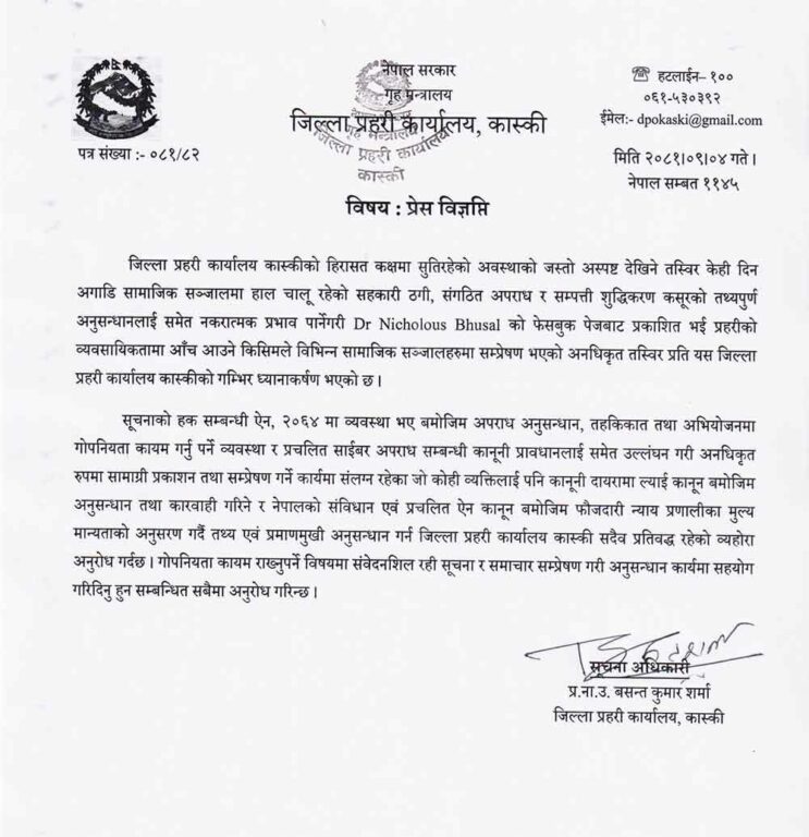विज्ञप्तिमा भनिएको छ, “केही दिनअगाडि सामाजिक सञ्जालमा हाल चालु रहेको सहकारी ठगी, संगठित अपराध र सम्पत्ति शुद्धीकरण कसुरको तथ्यपूर्ण अनुसन्धानलाई समेत नकरात्मक प्रभाव पार्ने गरी डा. निकोलस भुसालको फेसबुक पेजबाट प्रकाशित भई प्रहरीको व्यवसायिकतामा आँच आउने किसिमले विभिन्न सामाजिक सञ्जालमा सम्प्रेषण भएको अनधिकृत तस्बिरप्रति यस जिल्ला प्रहरी कार्यालय कास्कीको गम्भीर ध्यानाकर्षण भएको छ ।”