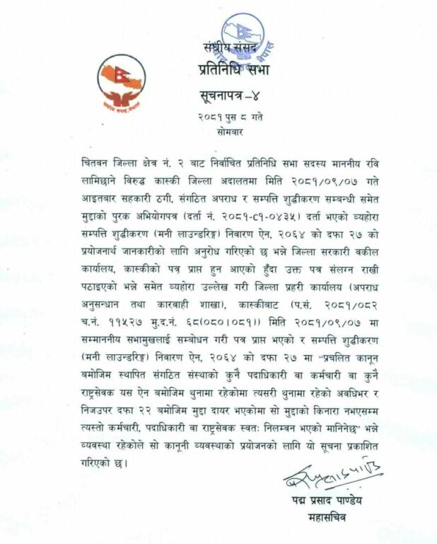 संसद सचिवालयका महासचिव पद्मप्रसाद पाण्डेयले सोमबार सूचना प्रकाशित गरी निलम्बन भएको जानकारी गराउनुभएको हो ।