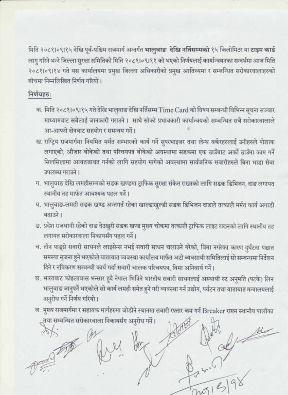 प्रमुख जिल्ला अधिकारी कृष्ण प्रसाद लम्सालको संयोजक्त्वमा बसेको जिल्ला सुरक्षा समितिको बैठकले भालुबाङ–नर्तीसम्मको १५ किमी क्षेत्रमा तीन महिना परीक्षणका लागि टाइम कार्ड प्रणाली लागू गर्ने निर्णय गरेको हो । शनिवारको निर्णय अनुसार प्रतिघण्टा ४० किमीको गतिमा मात्र सवारी चलाउन पाइनेछ।
