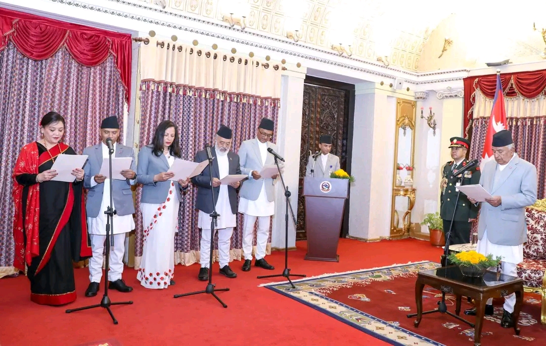राजदूत प्रकाशमणी पौडेल गणतन्त्र पोर्चुगल, डा.नेत्रप्रसाद तिम्सिना मलेसिया, प्रा.डा.कपिलमान श्रेष्ठ गणतन्त्र दक्षिण अफ्रिका, सेवा लम्साल बेल्जियम अधिराज्य र सुम्निमा तुलाधर डेनमार्कले आज राष्ट्रपति पौडेलसमक्ष पद तथा गोपनीयताको शपथ लिएका छन् ।