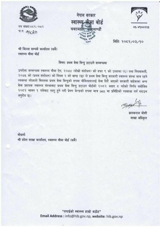 जुन जिल्लाको नागरिक भएपनि बिमामा जुन अस्पतालाई प्रथम विन्दु उल्लेख गरेपनि मुलुकको कुनै पनि सरकारी अस्पतालमा उहाँहरुले अब पहिलो विन्दुका रुपमा सेवा लिन सक्नु हुने छ । अब प्रथम सेवा विन्दुका रुपमा जुनसुकै सरकारी स्वास्थ्य संस्था अस्पताल रहेन छन् । यो ब्यवस्था साउन १ गतेबाट लागु हुने छ । स्वास्थ्य मन्त्रालयका प्रवक्ता डाक्टर प्रकाश बुढाथोकीले नेपालटिभी अनलाइनलाई बताए ।