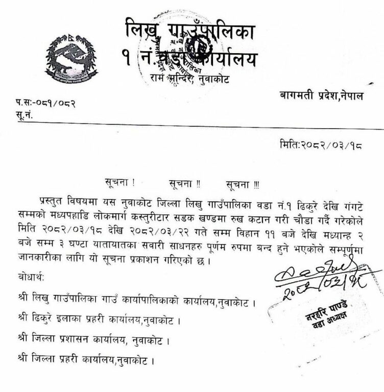 लिखु गाउँपालिका–१ वडा कार्यालयले सार्वजनिक सूचना जारी गर्दै यहि असार १८ गतेदेखि २२ गते आइतवारसम्म प्रत्येक दिन बिहान ११ बजेदेखि दिउँसो २ बजेसम्म सम्पूर्ण सवारी साधनको आवागमनमा रोक लगाइएको जानकारी दिएको हो।