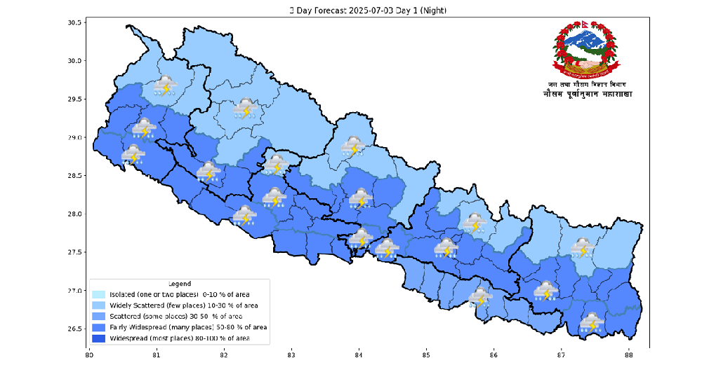 त्यसैगरी, आज राति देशभर आंशिकदेखि साधारणतया बदली हुनेछ । कोशी प्रदेश, बागमती र गण्डकी प्रदेशका केही र अन्य प्रदेशका एक–दुई स्थानमा मेघगर्जन र चट्याङसहित हल्कादेखि मध्यम वर्षाको सम्भावना छ । कोशी, बागमती र गण्डकी प्रदेशका एकदुई स्थानमा भारी वर्षाको सम्भावना छ । साथै देशका उच्च पहाडी तथा हिमाली भागका केही स्थानमा हल्कादेखि मध्यम वर्षा र हिमपातको सम्भावना रहेको महाशाखाले जनाएको छ ।