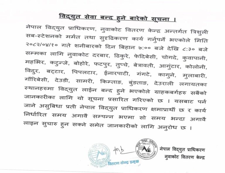 नुवाकोटका दर्जनौँ स्थानमा शनिबार विद्युत सेवा अवरुद्ध हुने