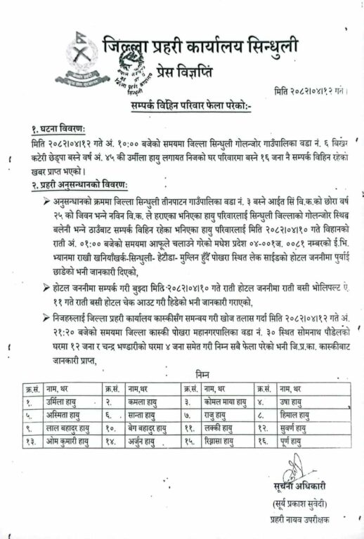 सिन्धुलीबाट हराएका हायु परिवारका सबै १६ जना पोखरामा फेला परे