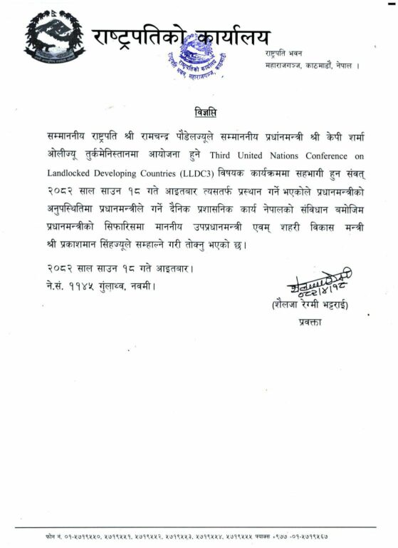 प्रधानमन्त्री केपी शर्मा ओली भूपरिवेष्ठित विकासशील राष्ट्रहरू (एलएलडिसी)को तुर्कमेनिस्तानमा हुने तेस्रो संयुक्त राष्ट्रसङ्घीय सम्मेलनमा भाग लिन गएराती त्यसतर्फ प्रस्थान गरेका छन् ।