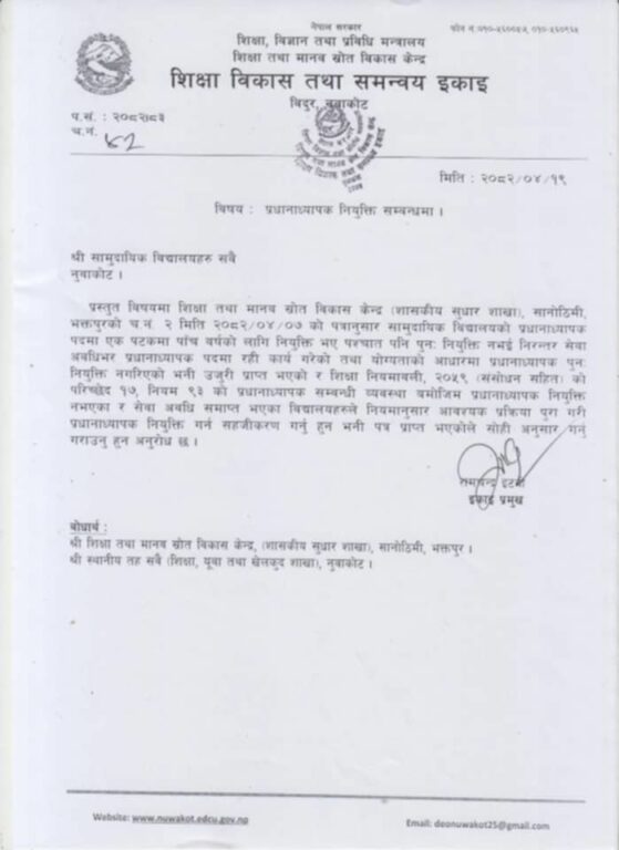 नुवाकोट, साउन १९ — नुवाकोटका सामुदायिक विद्यालयमा प्रधानाध्यापक नियुक्तिका लागि प्रक्रिया अघि बढाइएको छ। शिक्षा विकास तथा समन्वय इकाई नुवाकोटले जिल्लाका १२ वटै स्थानीय तहलाई पत्र पठाउँदै प्रधानाध्यापक नियुक्तिका लागि कानुनी प्रक्रिया पालना गर्न आग्रह गरेको हो।