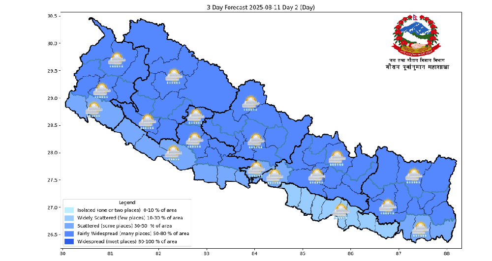 जसका कारण देशका पहाडी भू–भागका धेरै स्थानहरूमा र मधेश प्रदेश लगायत देशका बाँकी तराई भू–भागका केही स्थानहरूमा मध्यम वर्षाको सम्भावना रहेको छ ।