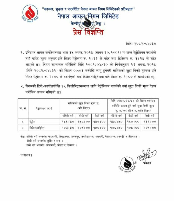 यता डिजेल र मट्टीतेलको मूल्य भने घटाएको छ।