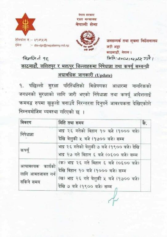 निर्देशनालयका अनुसार भदौ २६ गते बिहीबार बिहान १० बजेदेखि बेलुकी ५ बजेसम्म निषेधाज्ञा लागू हुनेछ। त्यसपछि बिहीबार बेलुकी ७ बजेदेखि शुक्रबार बिहान ६ बजेसम्म कर्फ्यू आदेश जारी रहनेछ।