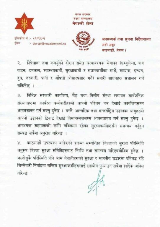 सैनिक जनसम्पर्क निर्देशनालयले बुधबार विज्ञप्ति जारी गर्दै पछिल्लो सुरक्षा परिस्थितिको विश्लेषणका आधारमा नागरिकको धनजनको सुरक्षाका लागि निषेधाज्ञा र कर्फ्यू आदेश लागू गरिएको जानकारी दिएको हो।