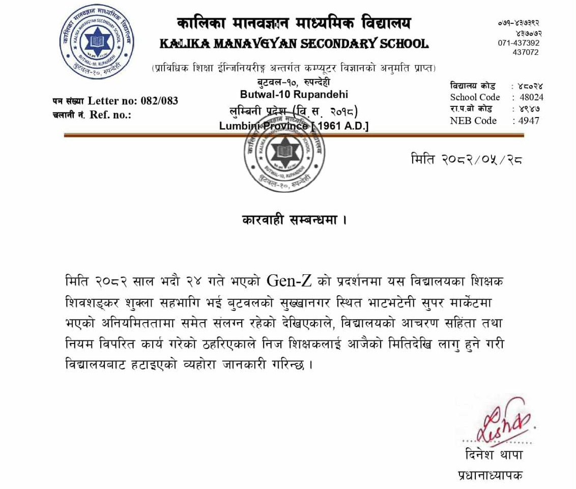विद्यालयका प्रधानाध्यापक दिनेश थापाले शनिबार एक सूचना जारी गर्दै शुक्लाले विद्यालयको आचरण संहिता उल्लङ्घन गर्ने काम गरेको उल्लेख गर्दै तत्काल प्रभावबाट लागू हुने गरी बर्खास्त गरिएको जानकारी दिए ।