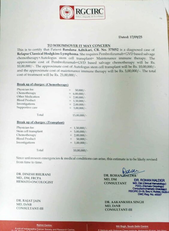 अस्पतालले सम्पूर्ण उपचारमा करिब ५० लाख रुपैयाँभन्दा बढी खर्च लाग्ने अनुमान गरेको छ। उच्च खर्च व्यवस्थापन गर्न कठिन भएकोले श्रीमान् मिलन गजुरेलले सबैमा सहयोगका लागि हार्दिक अपिल गरेका छन्।