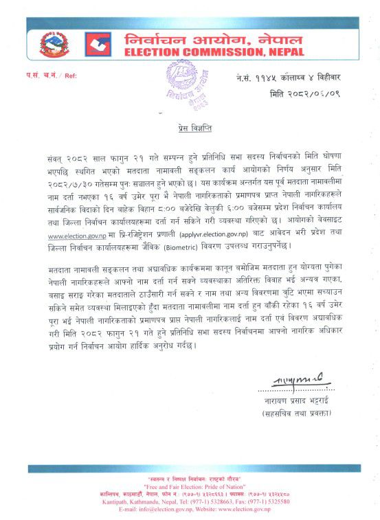 आयोगका प्रवक्ता तथा सहसचिव नारायण प्रसाद भट्टराईले मतदाता नामावलीमा नाम दर्ता हुन बाँकी रहेका १६ वर्ष पूरा गरेका सबै नेपाली नागरिकलाई आफ्नो नाम दर्ता गरी विवरण अद्यावधिक गर्न आग्रह गर्नु भएकाे छ। उहाँले आउँदो प्रतिनिधि सभा सदस्य निर्वाचनमा सहभागिता जनाई नागरिक अधिकार प्रयोग गर्न सबैलाई आयोगको तर्फबाट हार्दिक अनुरोध गर्नु भएकाे छ ।
