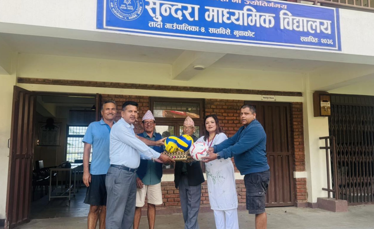 नुवाकोट, असोज १० । नुवाकोट जिल्लाको तादी गाउँपालिका–४ सातविसेस्थित सुन्दरा माध्यमिक विद्यालयलाई आज खेलकुद सामग्री सहयोग हस्तान्तरण गरिएको छ।