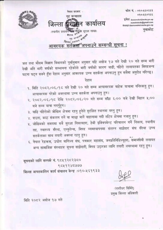 नुवाकोट प्रशासनद्वारा भारी वर्षा हुने भन्दै उच्च सतर्कता अपनाउन आग्रह